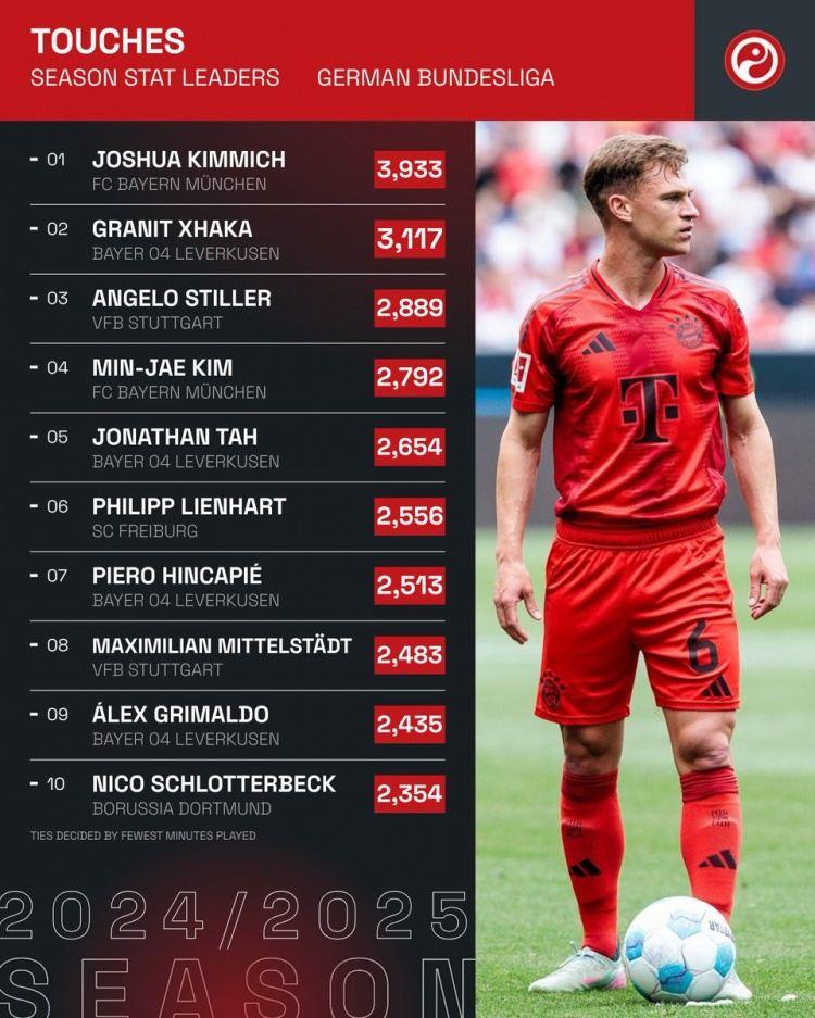 搜体育 足球资讯 德甲本赛季各项数据排名:基米希成功传球、成功长传、触球皆最多