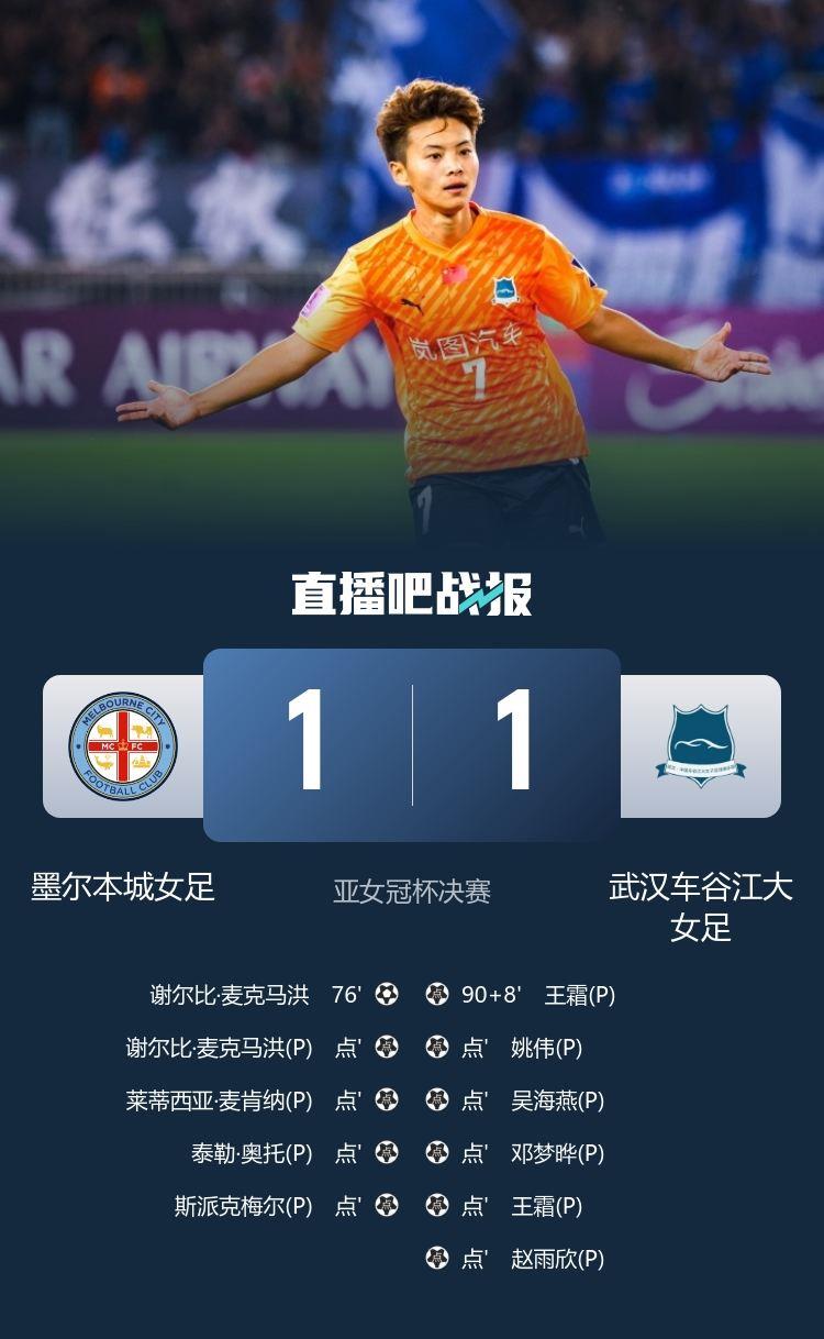 亚女冠杯决赛,武汉车谷江大女足点球大战战胜墨尔本城女足,夺得首届女足亚冠冠军。