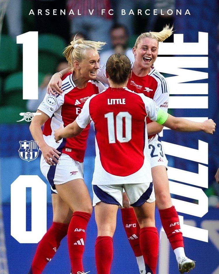 女足欧冠决赛,阿森纳女足1-0巴萨女足,队史第二次加冕女足欧冠冠军。