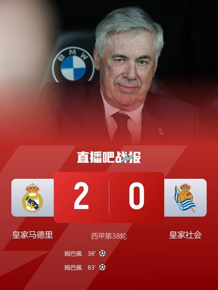 西甲联赛第38轮,皇马主场2-0皇家社会,安切洛蒂执教皇马最后一战,魔笛、巴斯克斯主场告别。