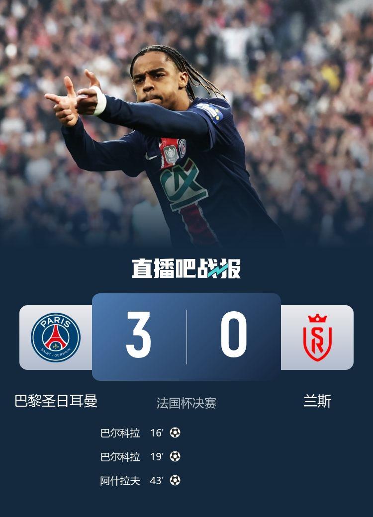 法国杯决赛,巴黎圣日耳曼3-0轻取兰斯,卫冕法国杯,巴尔科拉2射1传。