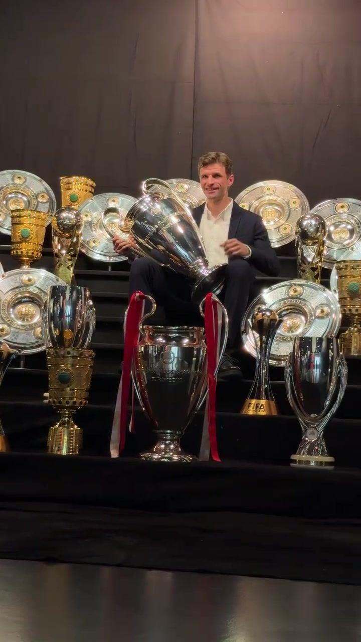 穆勒社媒晒出自己与拜仁生涯奖杯合影的视频,并写道:“祝贺巴黎赢得欧冠冠军,但希望很快又轮到拜仁。”