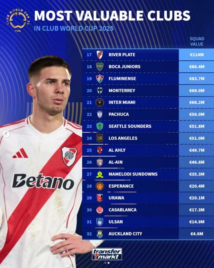 世俱杯开赛在即,德转列参赛各队总身价排名,皇马13.3亿欧居首,曼城、巴黎二三位。奥克兰城总身价最低,仅460万欧。