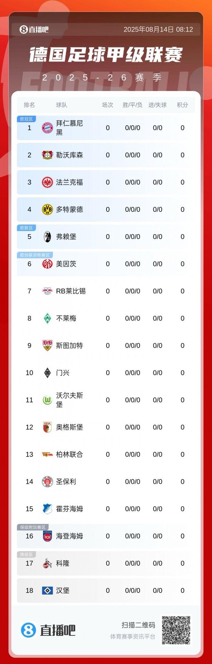 25/26赛季德甲18队:拜仁慕尼黑、勒沃库森、法兰克福、多特蒙德、弗赖堡、美因茨、RB莱比锡、不莱梅、斯图加特、门兴、沃尔夫斯堡、奥格斯堡、柏林联合、圣保利、霍芬海姆、海登海姆、科隆、汉堡