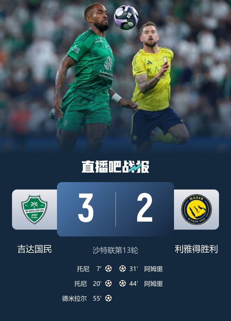 利雅得胜利遭11场联赛首败,各赛事9场不败终结,先赛2分领跑;托尼2射1传,两队补时各1人被罚下。