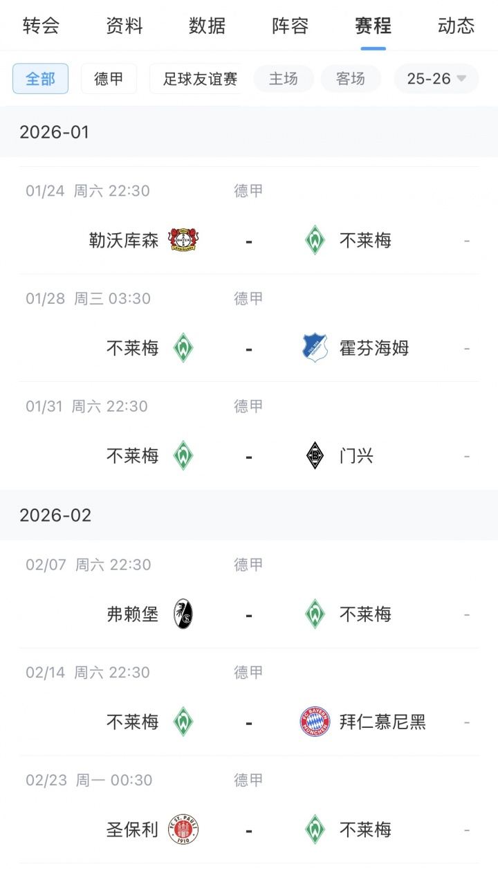 不莱梅在德甲17轮后,4胜6平7负排在第13位。球队未来一段时间赛程: