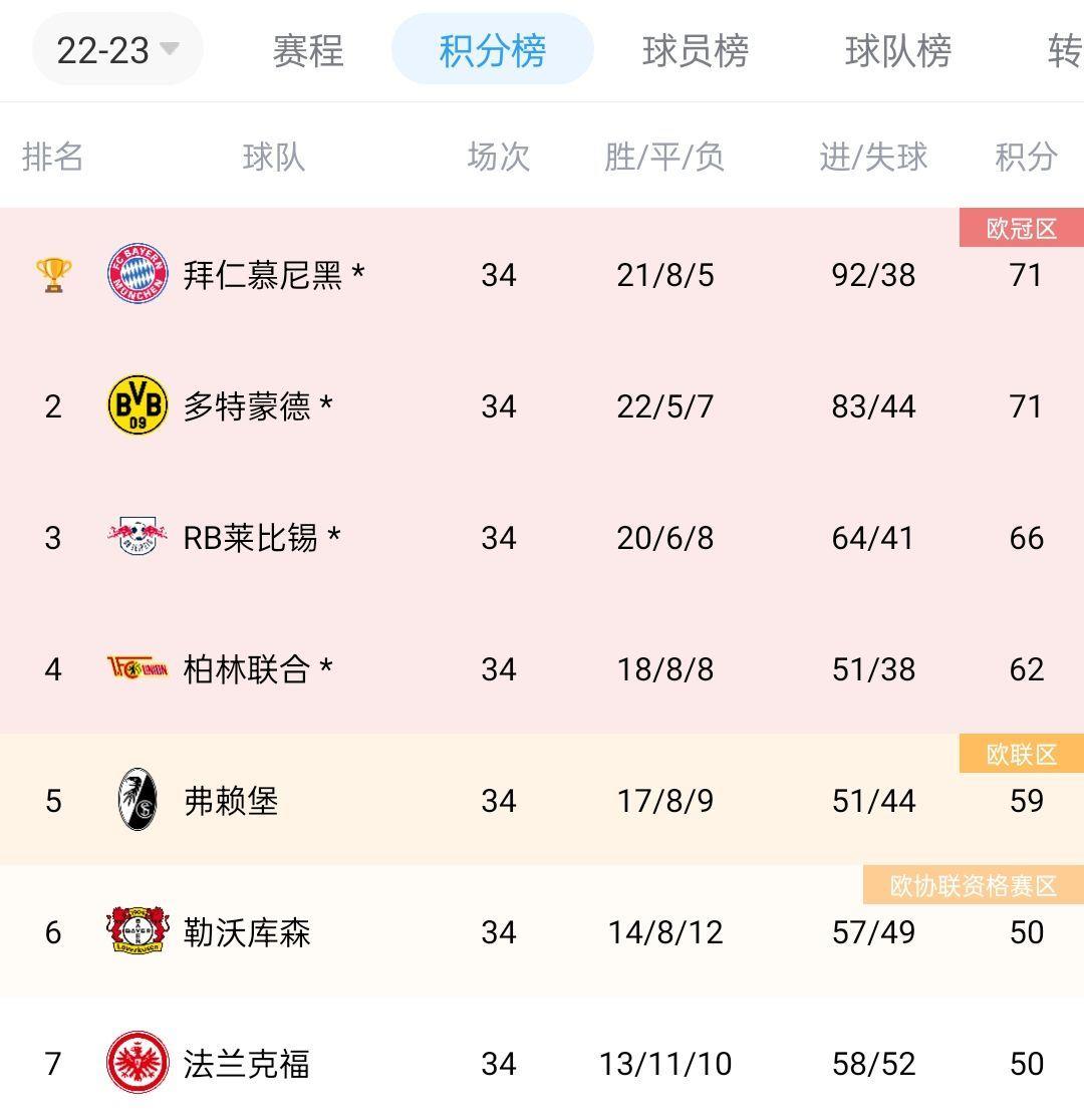 德甲积分榜↓