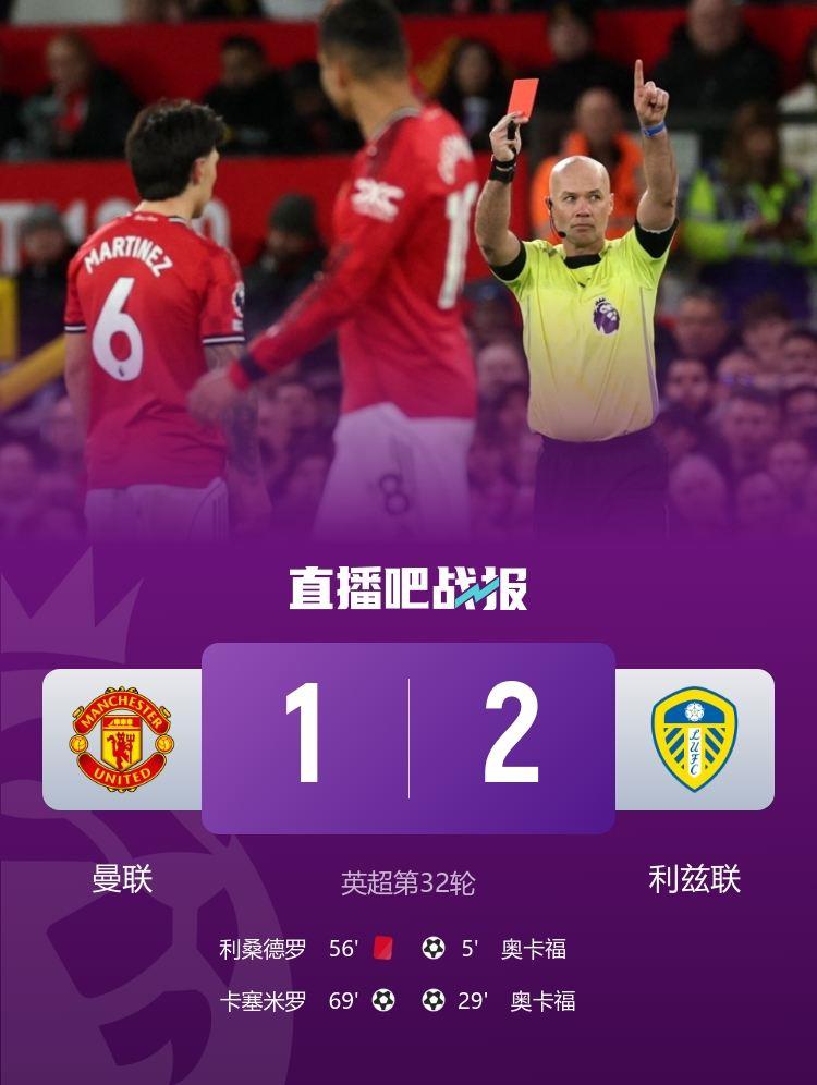 曼联1-2利兹联。积分榜方面,曼联55分第三,利兹联36分第十五。本场裁判判罚引起争议。