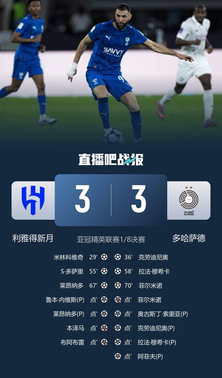 利雅得新月点球战总比分5-7遭多哈萨德淘汰,无缘亚冠八强。