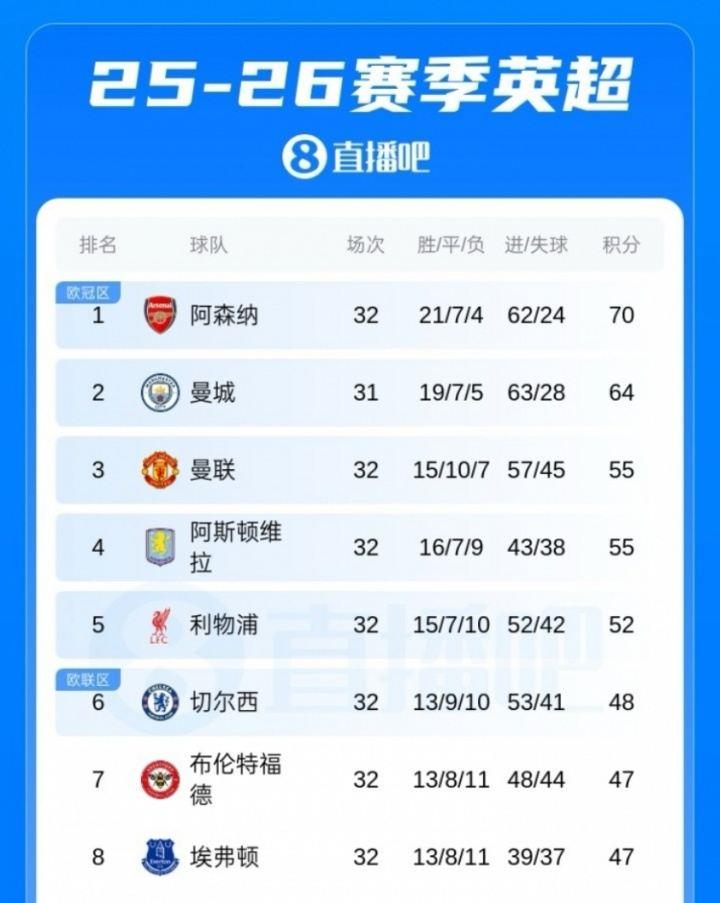 曼联仍排第三,与维拉同分,领先第六的切尔西7分。利兹联排第15,领先降级区6分。