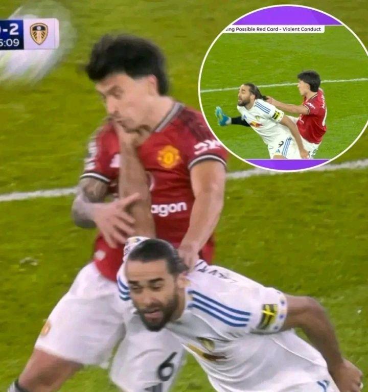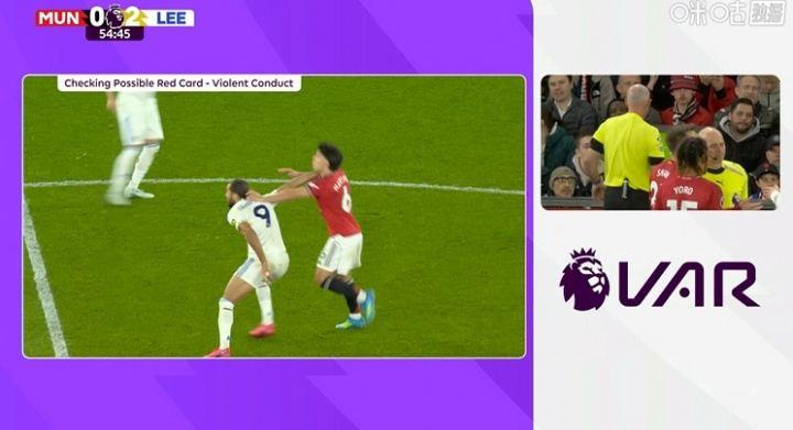 曼联对阵利兹联。55分钟, VAR介入,主裁亲自观看回放,判罚利桑德罗拉拽勒温头发,将其红牌罚下。