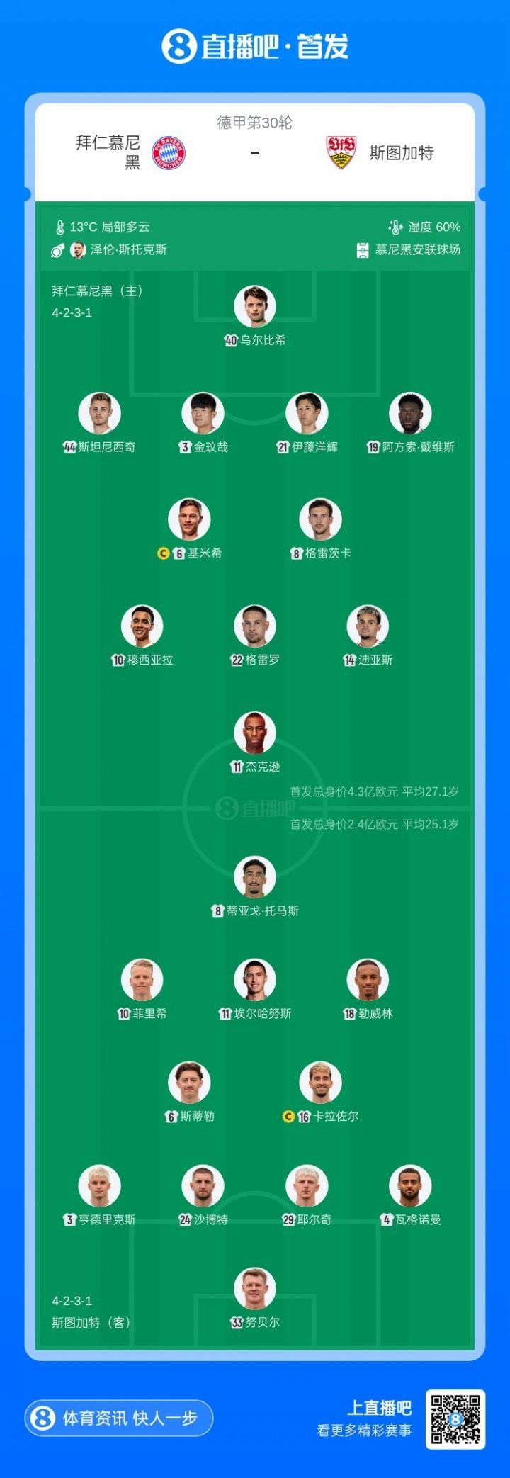 今晚北京时间23点30分,德甲第30轮,拜仁慕尼黑vs斯图加特,赛前首发阵容公布。本场拜仁只要拿分即可提前4轮夺冠。