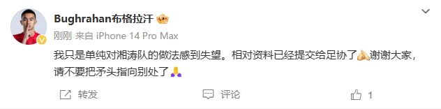 现布格拉汗将原微博删除,并进行了澄清:“我只是单纯对湘涛队的做法感到失望,相关资料已经提交给足协了。谢谢大家,请不要把矛头指向别处了🙏 ”