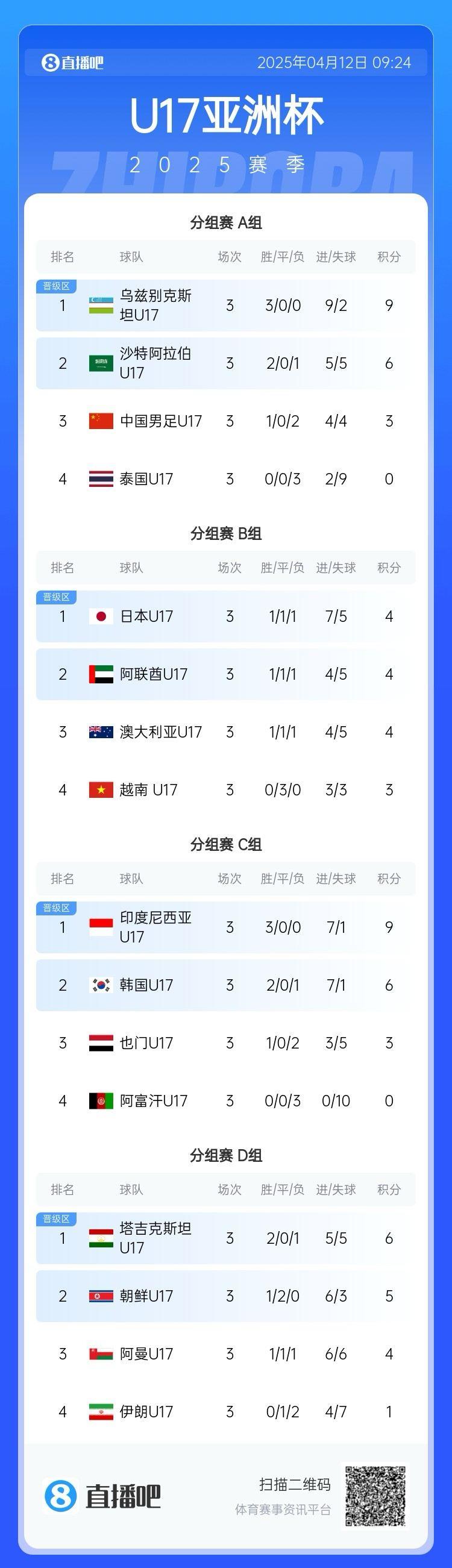 U17亚洲杯小组赛全部战罢,8强及对阵出炉,这8支球队也获得今年U17世界杯(世少赛)参赛资格。