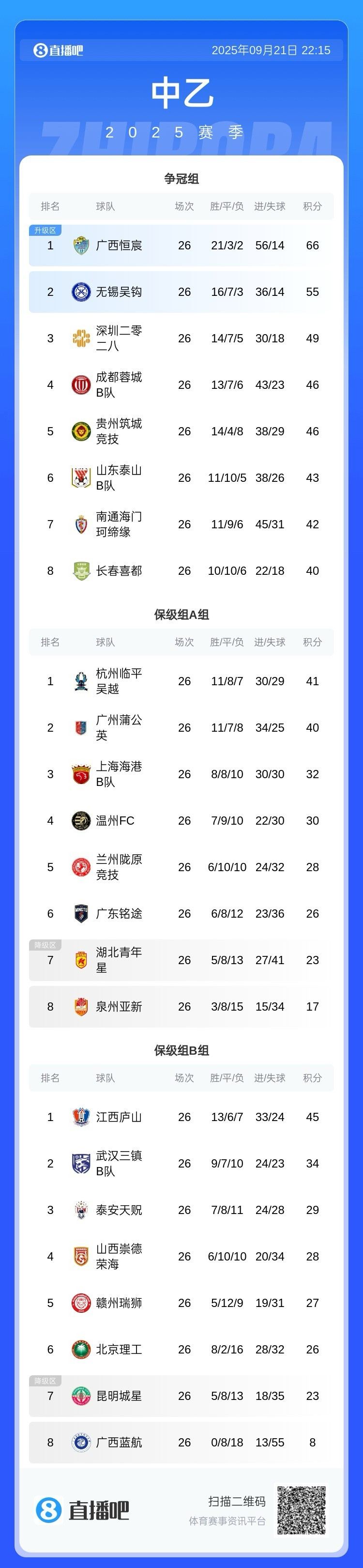 中乙第26轮结束争夺,保级组较量中,广西蓝航仍难求一胜,他们与泉州亚新分列两个小组倒数第一,海港B队2-0温州FC。