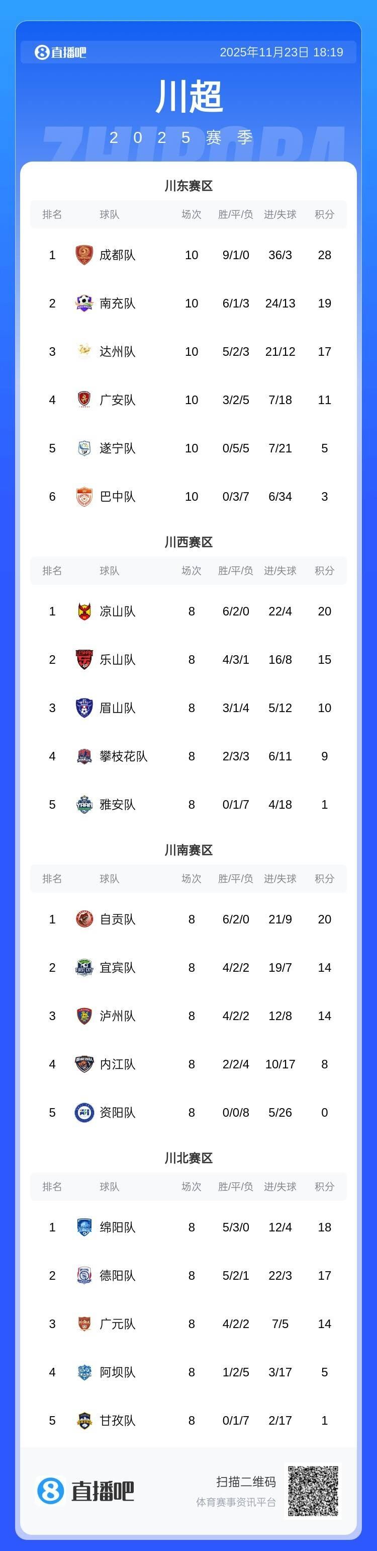 川超联赛第一阶段分区赛结束,9支球队晋级总决赛
