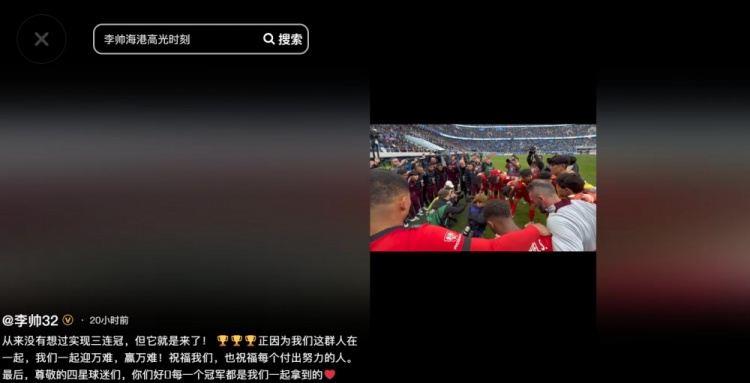 搜体育 足球资讯 李帅发文:尊敬的四星球迷们,每一个冠军都是我们一起拿到的
