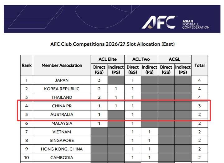 今日,亚足联官方公布2025/2026赛季亚足联男子俱乐部赛事中期排名榜,由于本赛季亚冠中超4队已经全军覆没,本赛季结束后中超有可能被澳超反超,导致27/28赛季亚冠名额由“1 1 1”变为“1 1”。