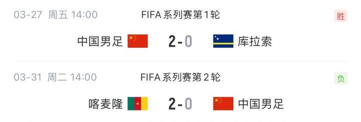 FIFA系列赛,国足2-0击败库拉索后0-2不敌喀麦隆。