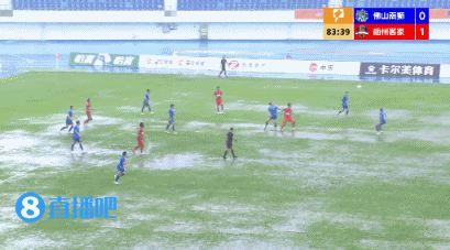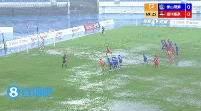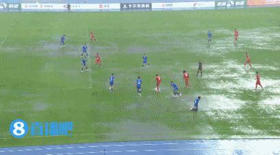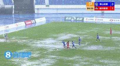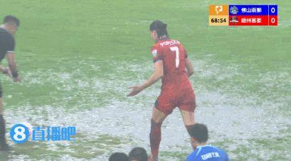 猛刨!佛山主场草地积水严重,波佩斯库罚点前球员们在点球点清水