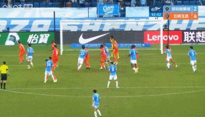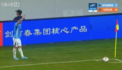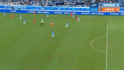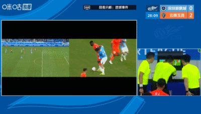 判例七:中超联赛第5轮,深圳新鹏城VS云南玉昆。比赛第26分钟,云南玉昆34号队员进球。裁判员初始判进球有效,经VAR介入,裁判员在场回看后,维持进球有效的初始决定。