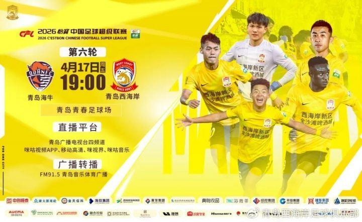 今晚19点中超第6轮青岛德比,青岛海牛vs青岛西海岸,赛前首发阵容公布。