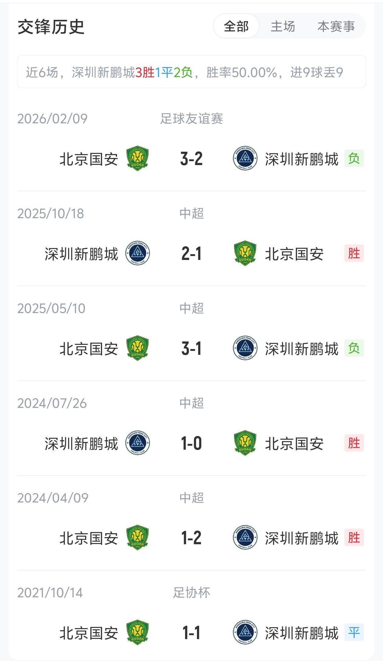 前6轮新鹏城2胜4负,近期遭遇两连败,积6分暂居第六;国安1胜2平3负,近期遭遇五轮不胜,积0分(国安被罚5分开局)暂居第十三。上赛季两回合交手,双方各自在主场取胜。