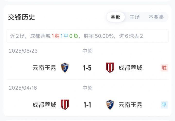 积分榜方面,蓉城前6轮5胜1平,积16分高居联赛榜首;玉昆则是3胜3负,积9分排在第4。