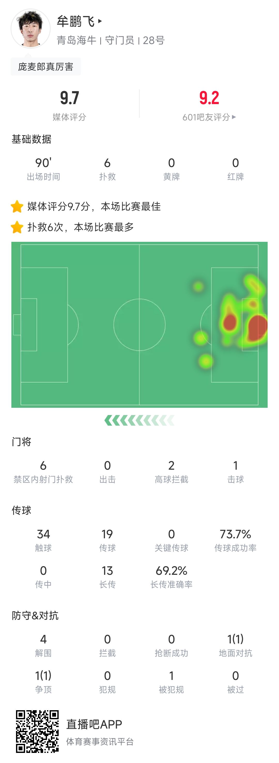 中超第7轮,青岛海牛0-2负于上海申花。本场比赛青岛海牛门将牟鹏飞全场高接抵挡贡献6次扑救,其中上半场一次极限三连扑,尽管丢掉两球,仍旧获得了9.7分的超高媒体评分。