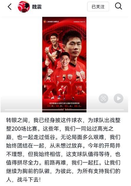 魏震在个人社交媒体中写道:转眼之间,我已经身披这件球衣,为球队出战整整200场比赛。这些年,我们一同站过高光之巅,也一起走过低谷。无论局面多么艰难,我们始终团结在一起,从未想过放弃。今年的开局并不理想,但我始终相信,这支球队值得等待,也值得拼尽全力。前路再难,我们一起扛。让我们继续为胸前的队徽,为彼此,为所有支持我们的人,战斗下去!