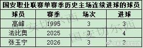 另外张玉宁联赛跨赛季连续四个主场都收获进球,国安历史跨赛季联赛主场连续进球最多的是2004-2005赛季的耶利奇,连续5场收获进球。国安历史联赛连续主场进球最多的是2019赛季的奥古斯托和2025赛季的法比奥,各连续6个主场收获进球。