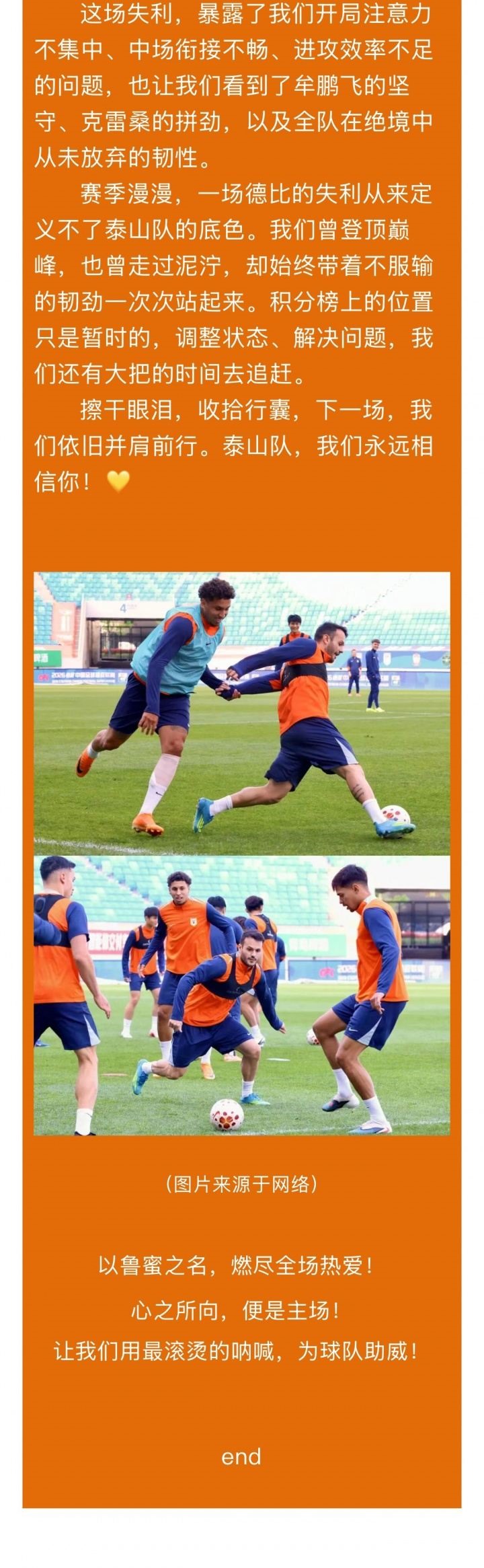 搜体育 足球资讯 德比1-4负!泰山官方未发战报 赞助商发战报:泰山的韧性永远滚烫