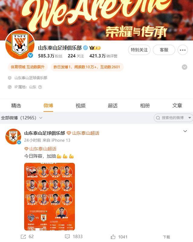 山东泰山官方微博和官方公众号最新一条内容是对阵青岛海牛的首发⬇️