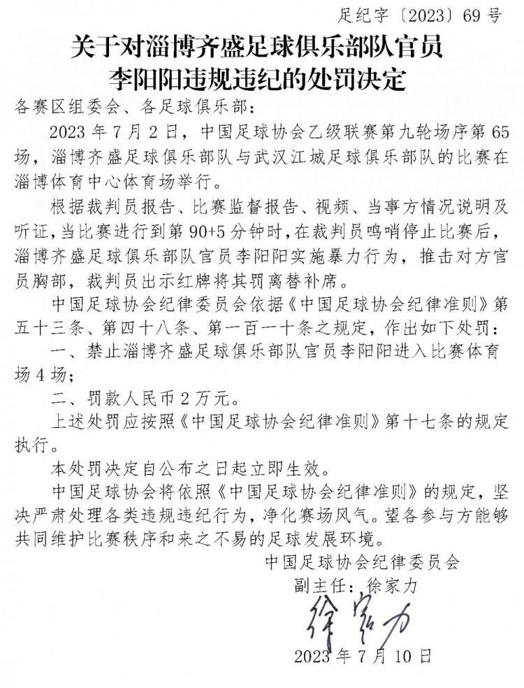 中国足协官方消息,武汉江城官员邢空停赛3场罚款1.5万元,淄博齐盛官员李阳阳停赛4场罚款2万元。