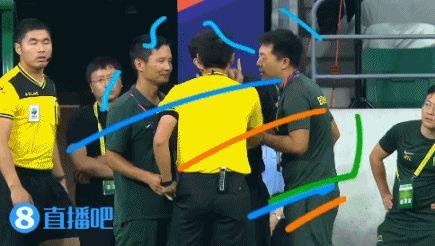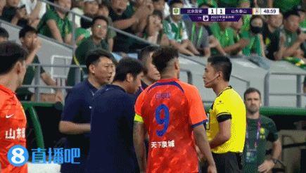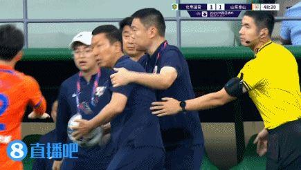 第50分钟,克雷桑倒地引发泰山替补席情绪激动表达不满,主裁马宁向崔康熙出示黄牌,同时向一名助教连续出示两张黄牌将其罚下↓