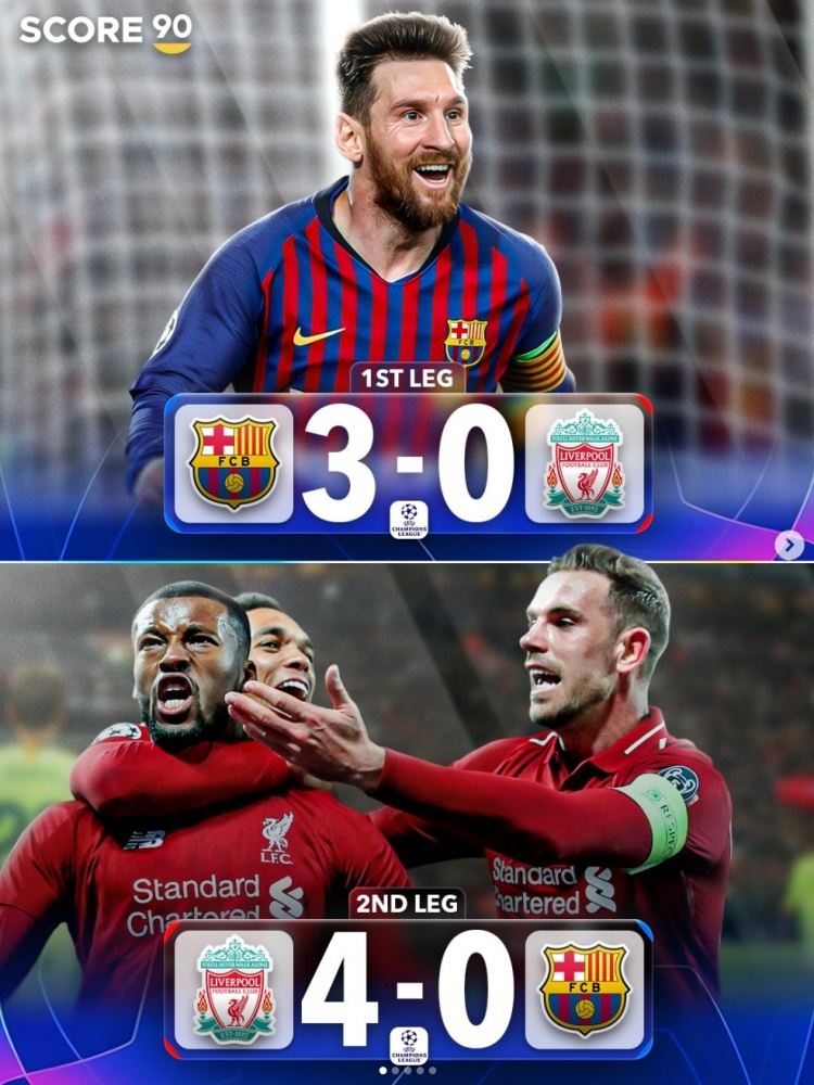 据score90统计,在欧冠历史上,仅出现过4次球队在首回合落后3球的情况下,次回合逆转取胜。