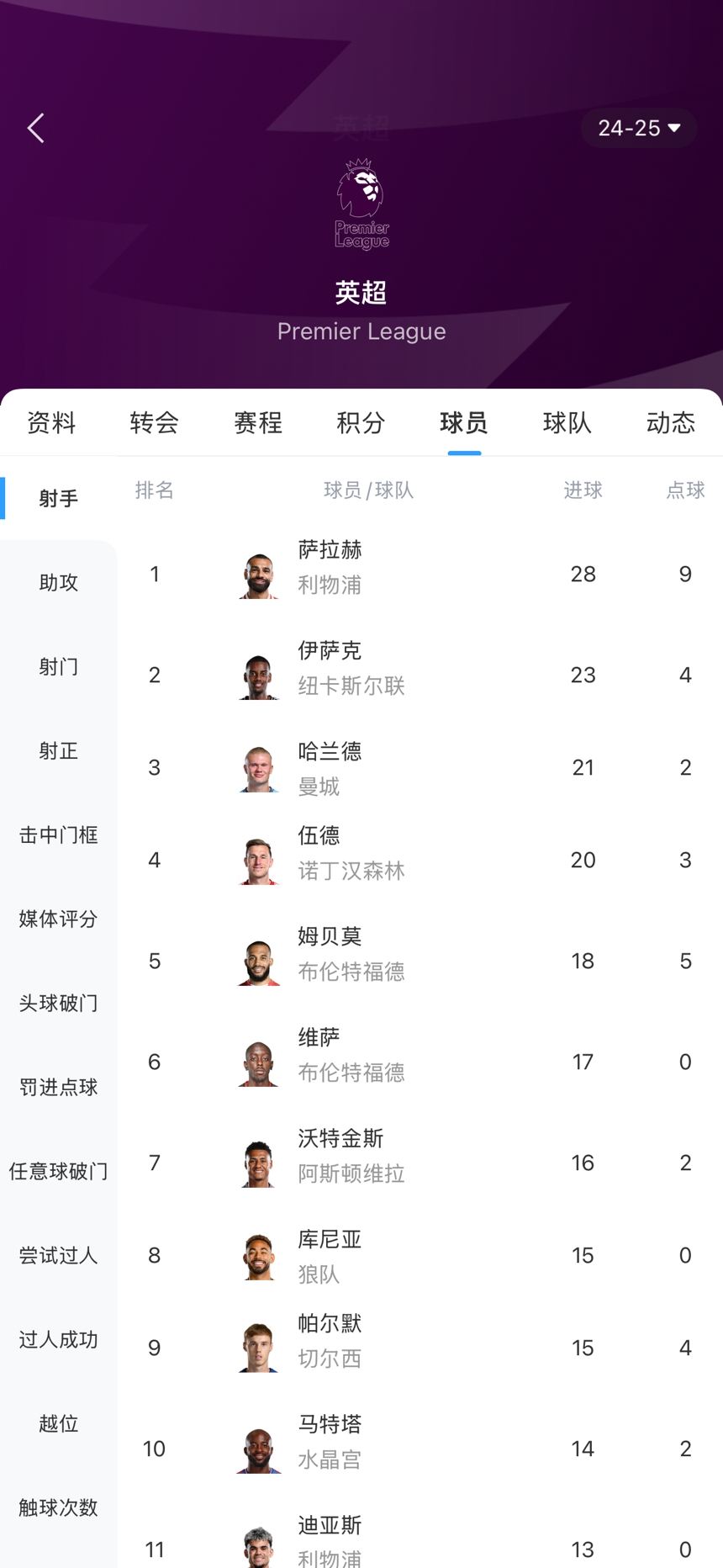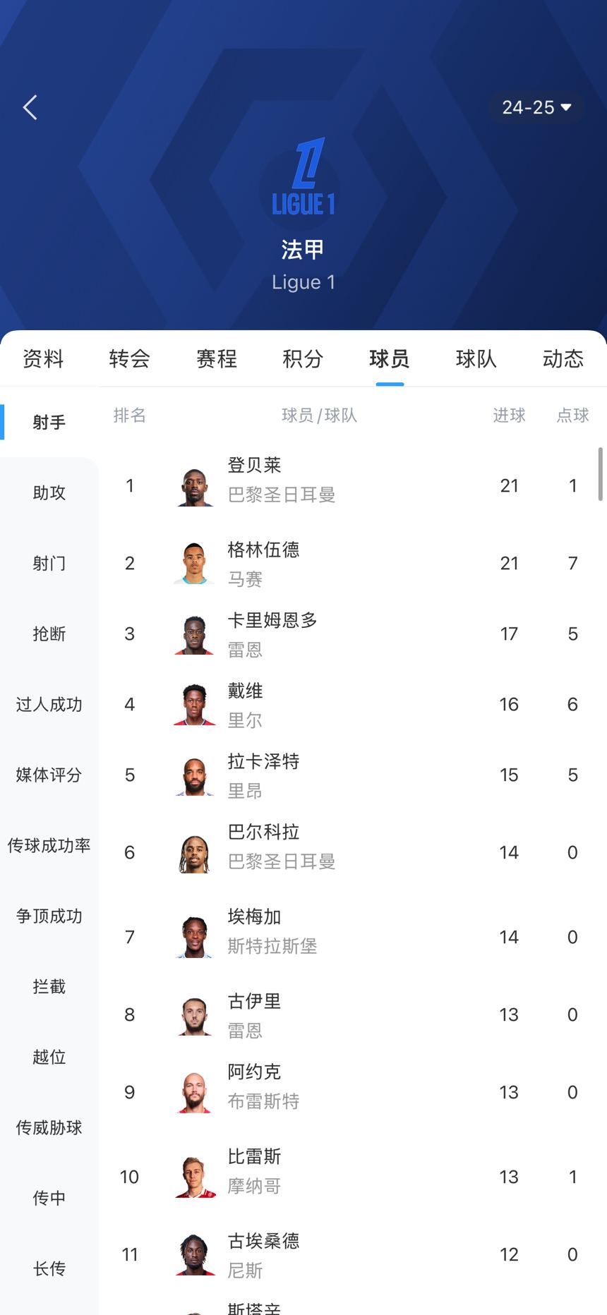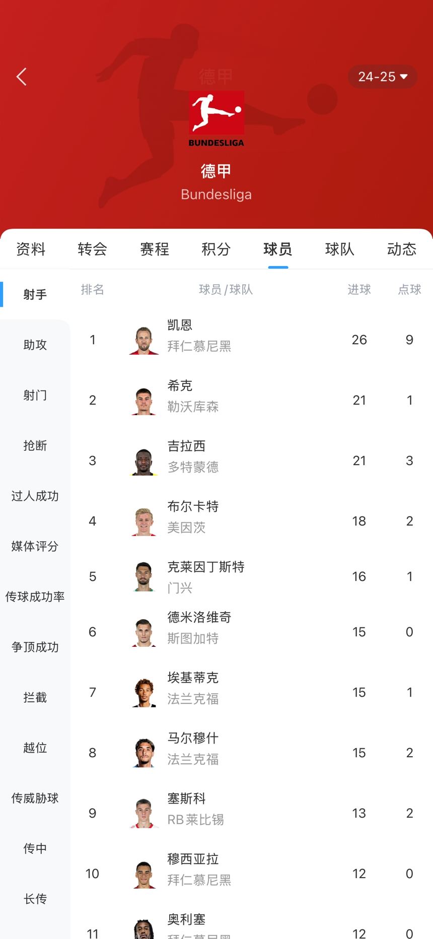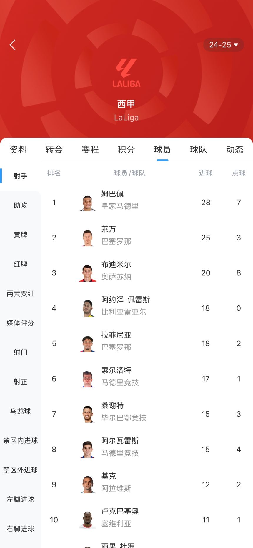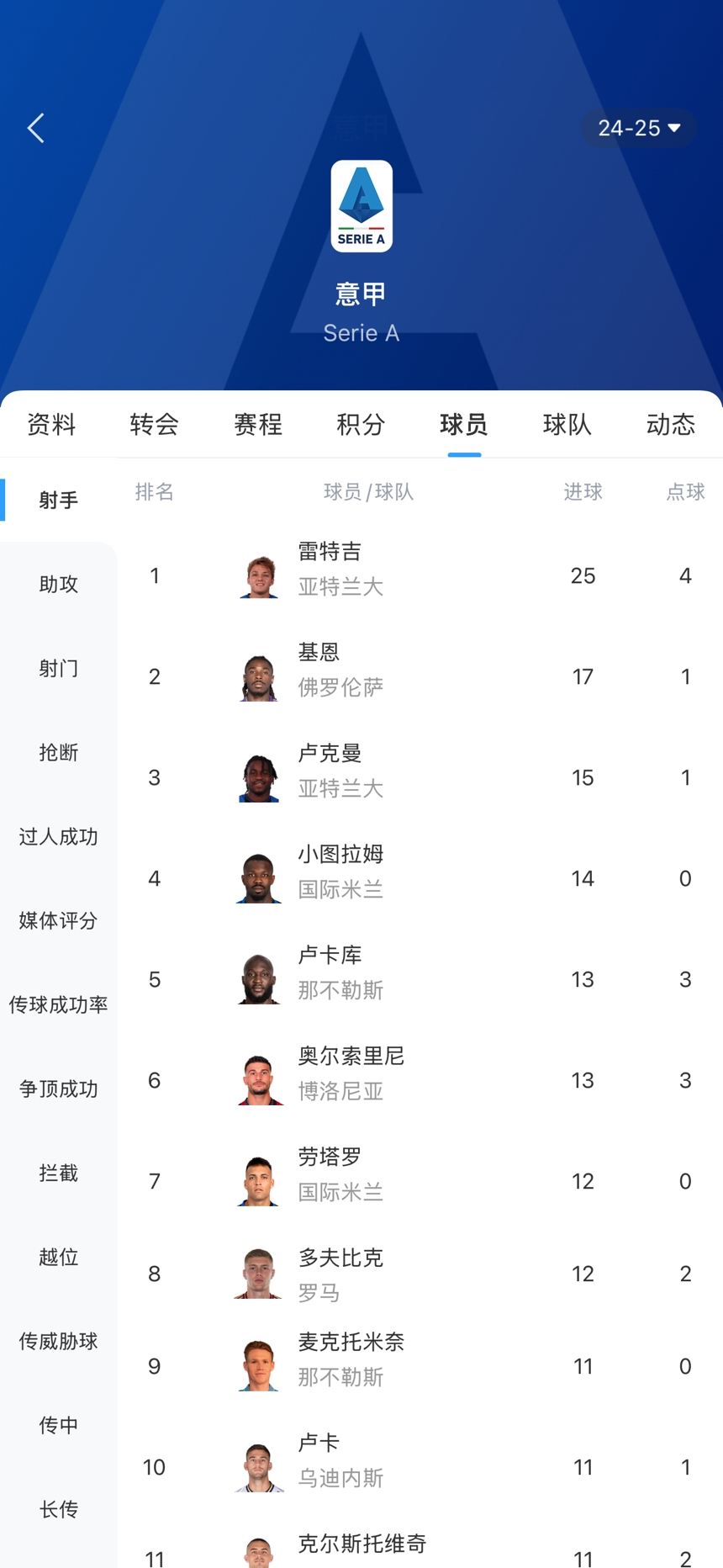 雷特吉25球(剩1场)居首,领先小基恩8球