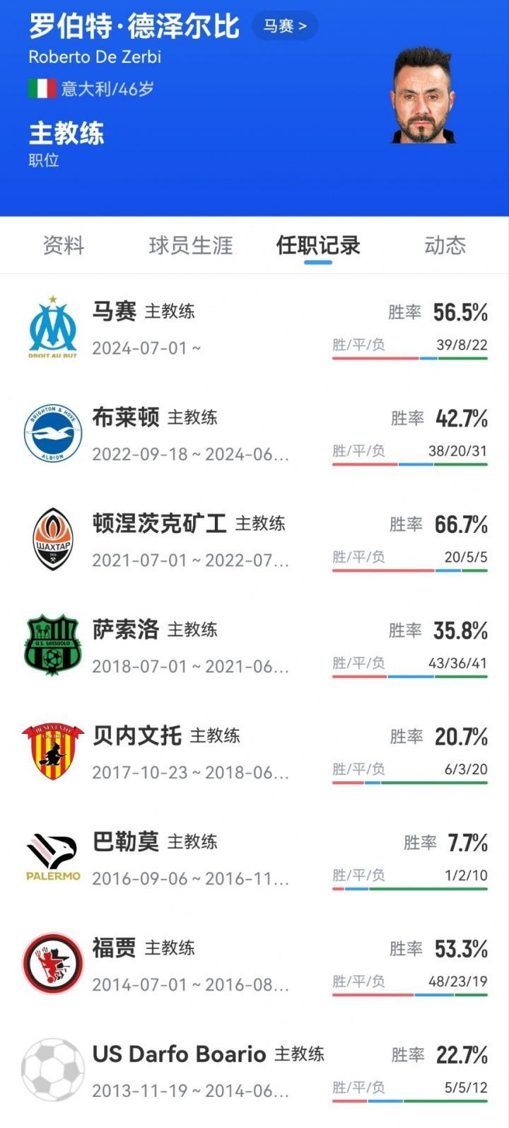 德泽尔比2024年7月出任马赛主帅,带队69场比赛,战绩为39胜8平22负。此前他曾执教布莱顿、顿涅茨克矿工、萨索洛、贝内文托、巴勒莫等球队。