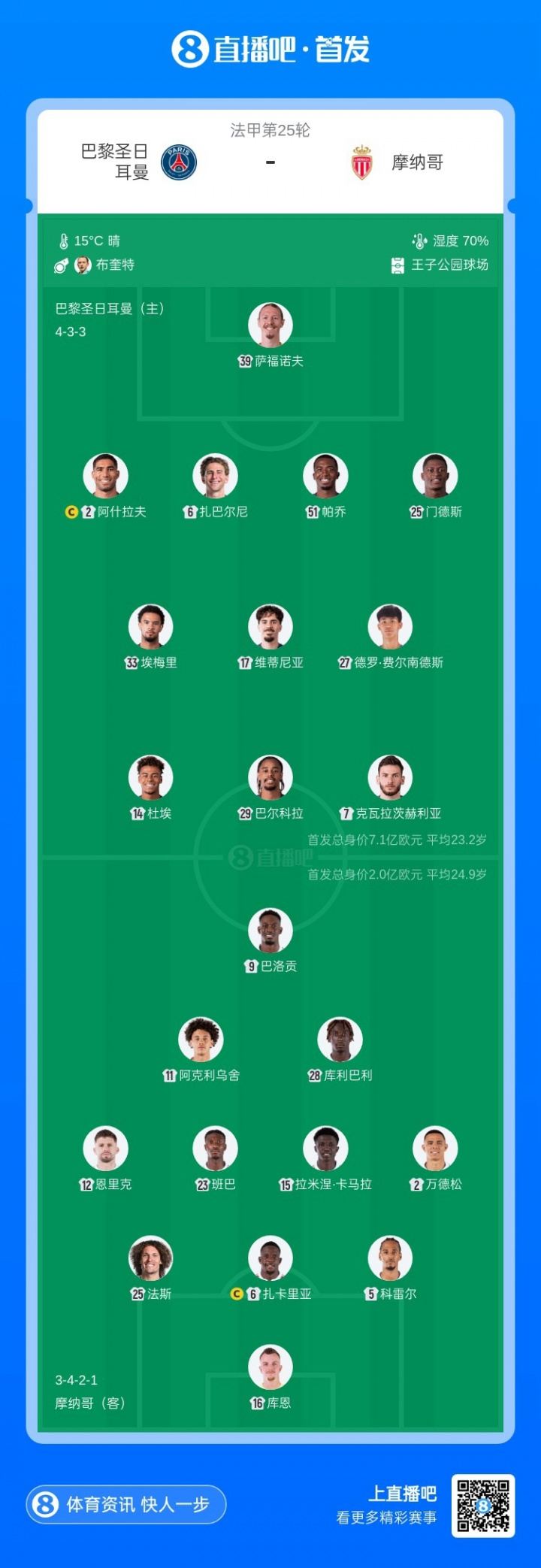 巴黎圣日耳曼首发:39-萨福诺夫、6-扎巴尔尼、51-帕乔、25-门德斯、2-阿什拉夫、27-德罗·费尔南德斯、17-维蒂尼亚、33-埃梅里、14-杜埃、7-克瓦拉茨赫利亚、29-巴尔科拉