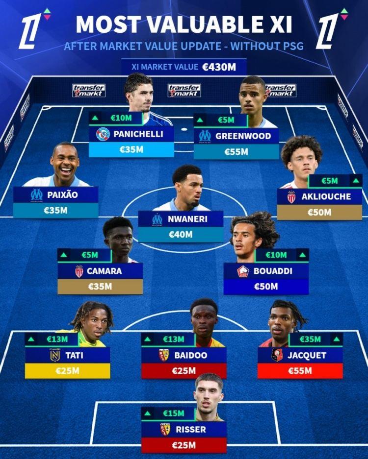 德国转会市场更新了法甲球员身价,并列出法甲身价最高阵容,巴黎圣日耳曼独占10席。