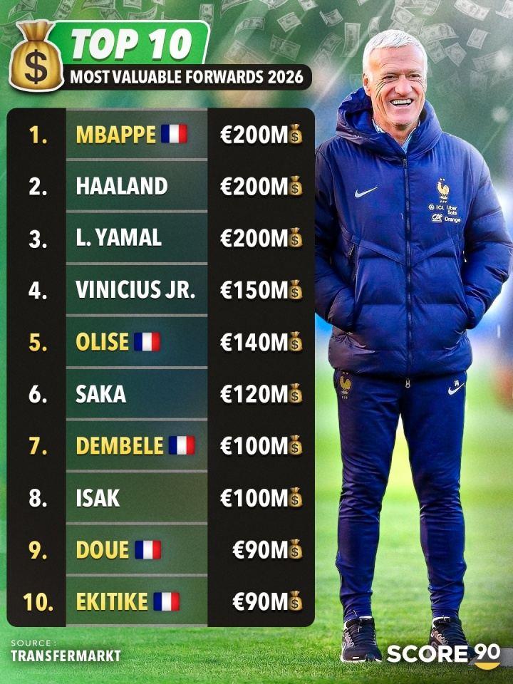 全球身价前十前锋中,法国球员占半数: