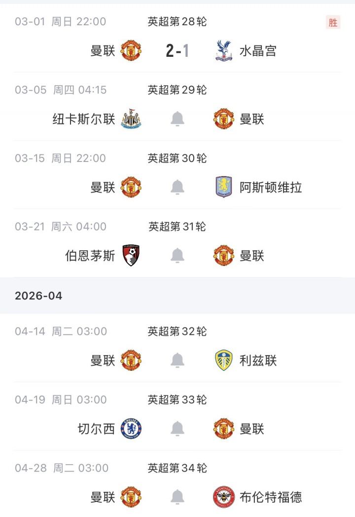 曼联最新赛程: