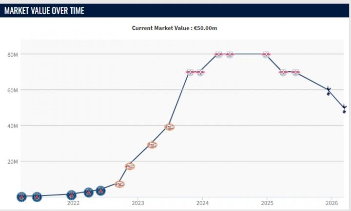 德转3月9日更新英超球员身价,其中哈维·西蒙斯身价降至5000万欧。