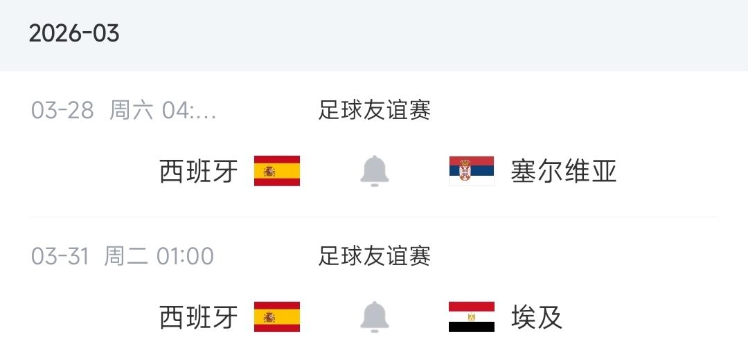 西班牙本月将在国内进行两场友谊赛,分别是北京时间3月28日凌晨4点对阵塞尔维亚、3月31日凌晨1点对阵埃及。