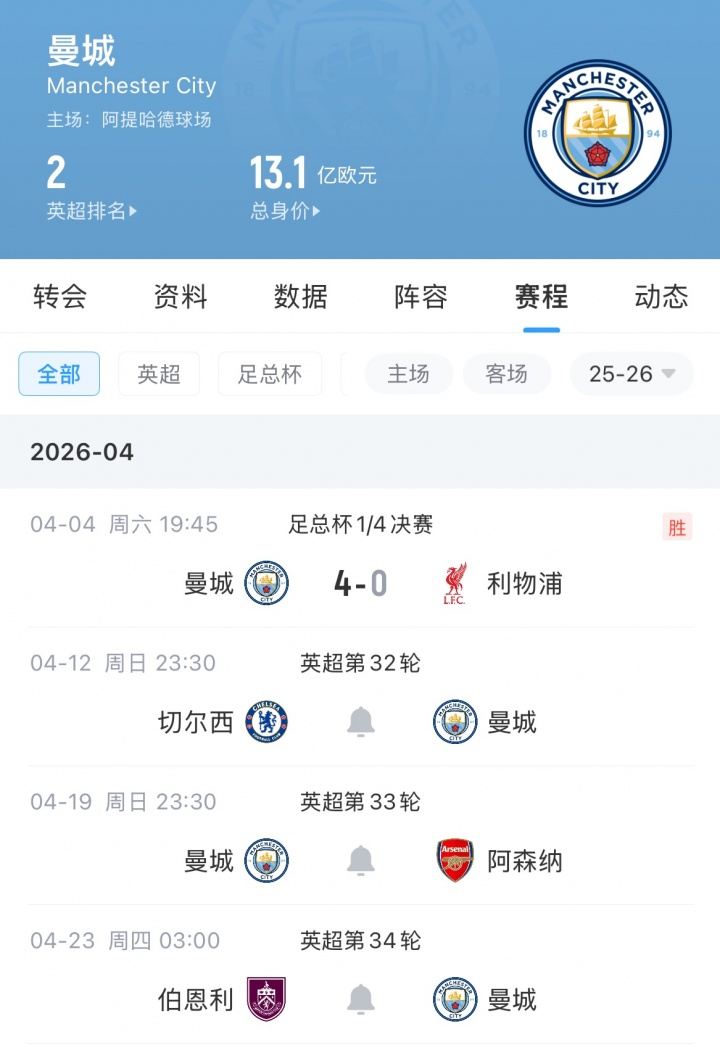 接下来,北京时间4月23日凌晨,曼城将客战伯恩利,而阿森纳要等到3天后才会迎战纽卡。这意味着曼城只需要赢球并取得足够净胜球,就可以超越阿森纳。
