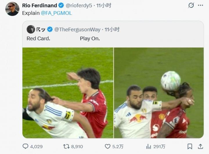 曼联名宿费迪南德在社媒转发了利马对勒温犯规和勒温肘击约罗的对比照,并艾特英超裁判公司要求解释。