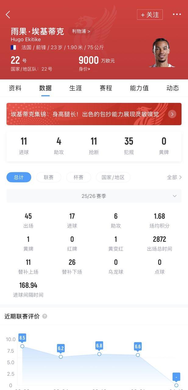 欧冠1/4决赛次回合,利物浦0-2总比分0-4遭巴黎淘汰。比赛第28分钟,埃基蒂克在无对抗情况下倒地出现伤情,被萨拉赫换下。
