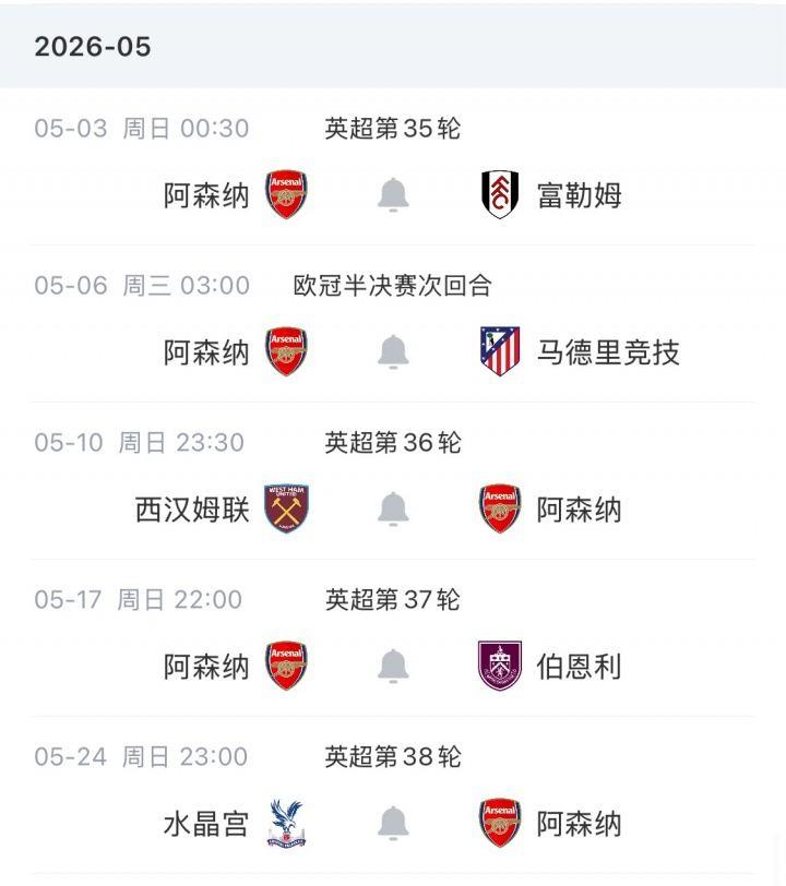 阿森纳赛程:
