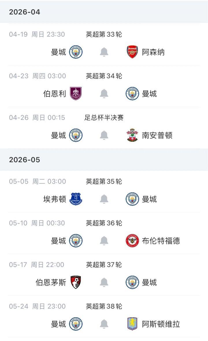 曼城赛程: