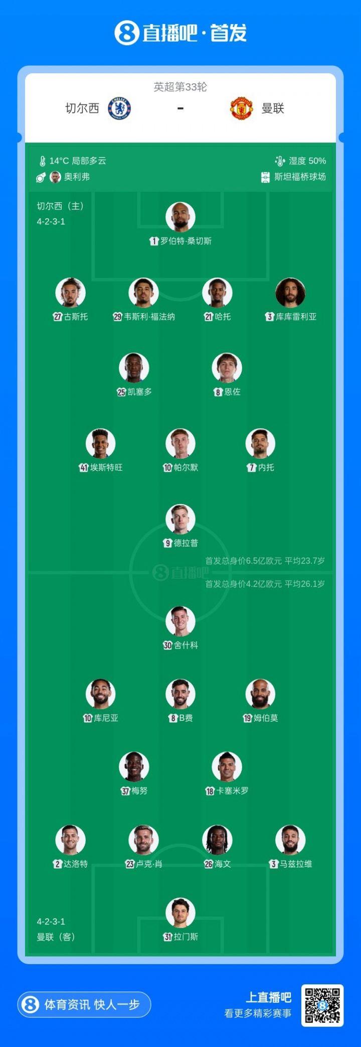 英超第33轮,切尔西主场迎战曼联,赛前双方首发公布。切尔西方面,恩佐解除队内禁赛回归,帕尔默、德拉普、内托先发出战;曼联方面,梅努、姆伯莫、达洛特先发,齐尔克泽、阿玛德替补待命。